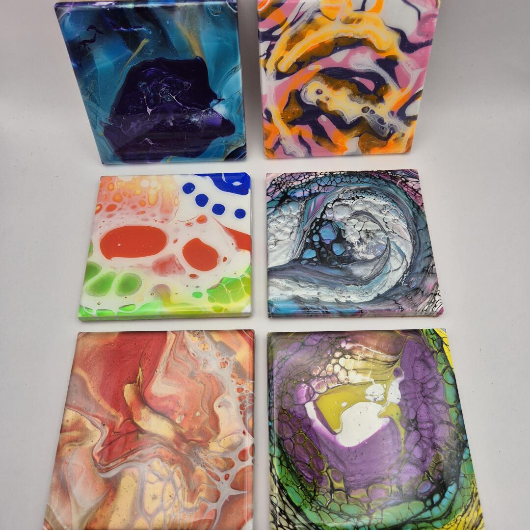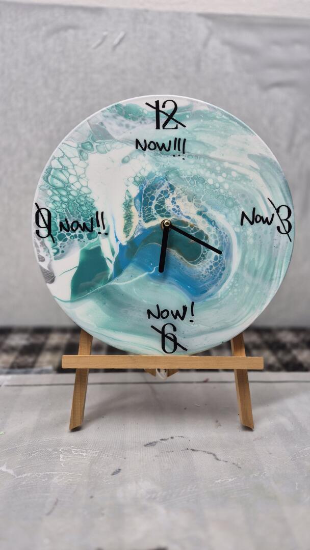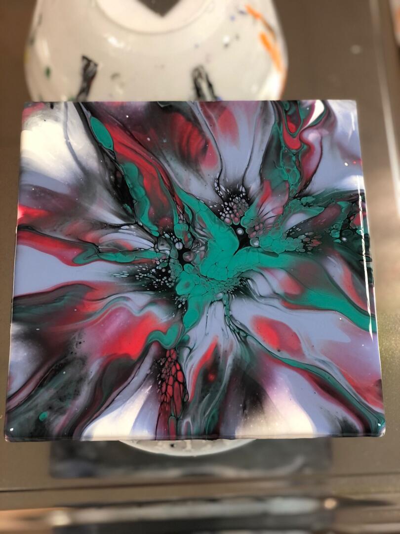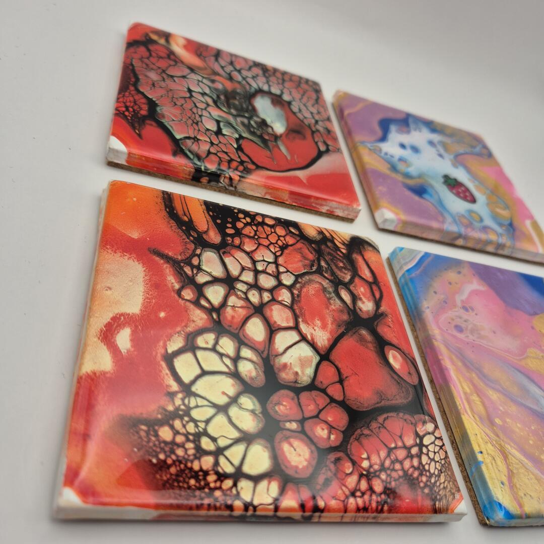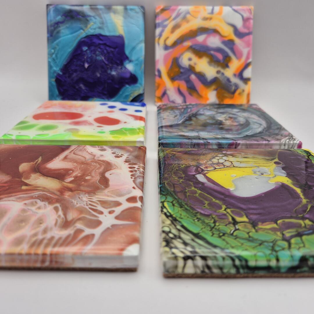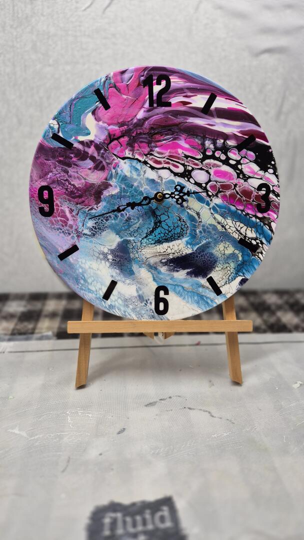 Workshop začíná uvítáním – čeká vás welcome drink, ochranná zástěra a společné seznámení s tím, jak správně míchat a lít akrylové i pigmentové barvy. Pak už se pustíte do vlastního tvoření. Vyberete si, zda chcete malovat keramické podtácky, obraz na plátně nebo vytvořit stylové hodiny ze staré gramofonové desky. A pokud vás láká zkusit všechno, je tu varianta „all in“ – s magnetkou a boxem na kapesníky jako bonusem.