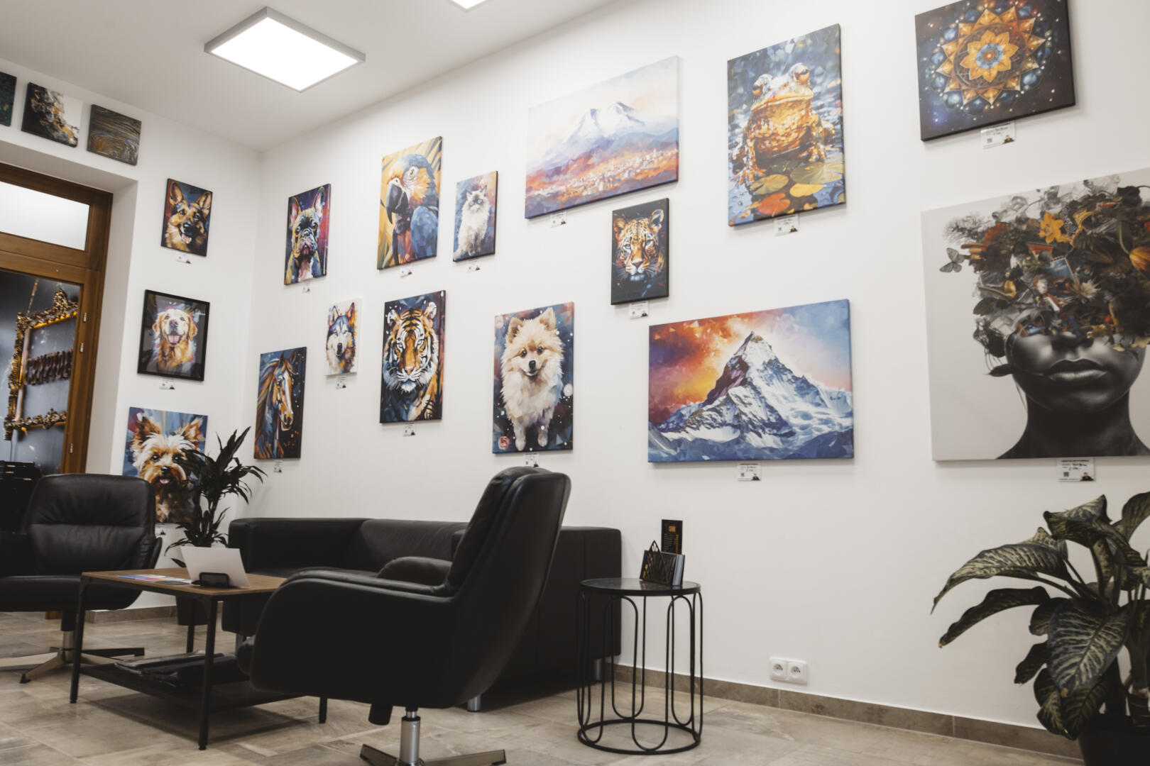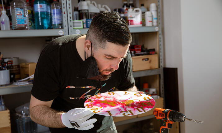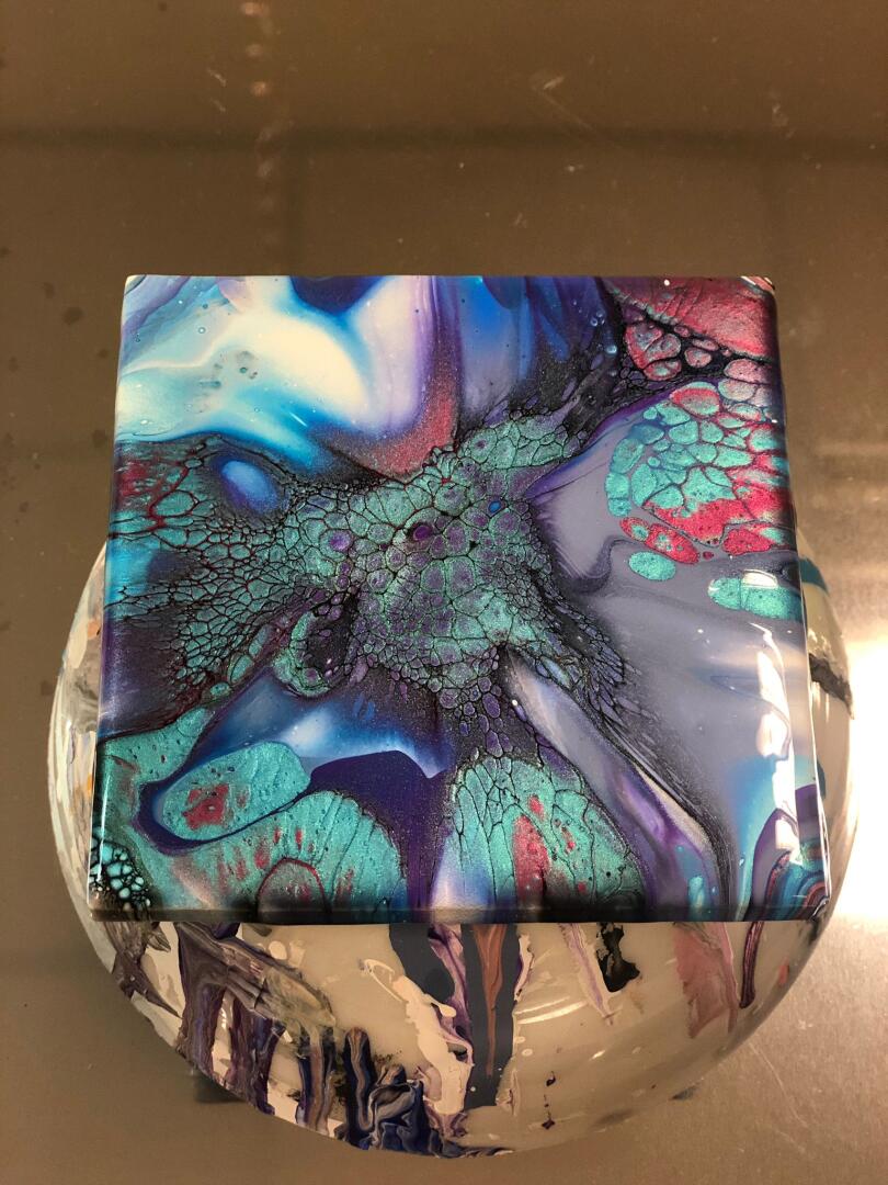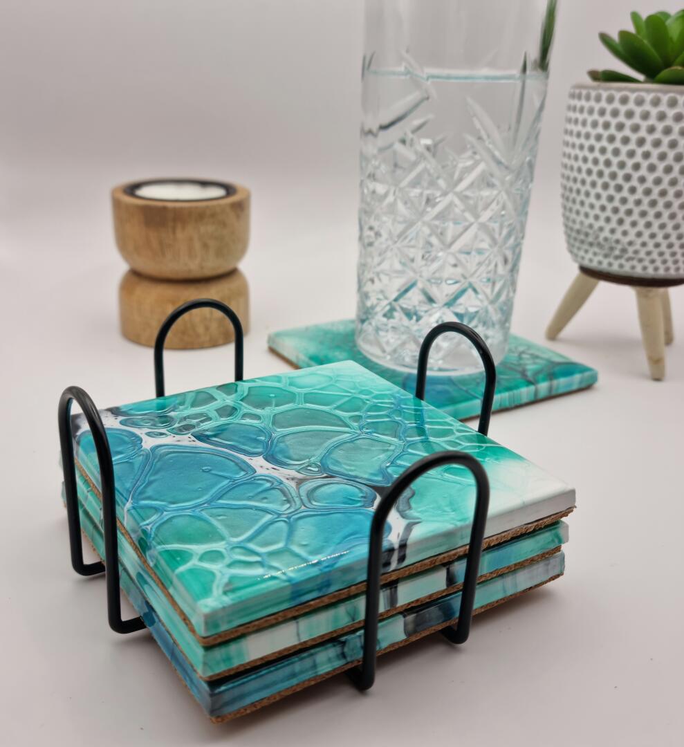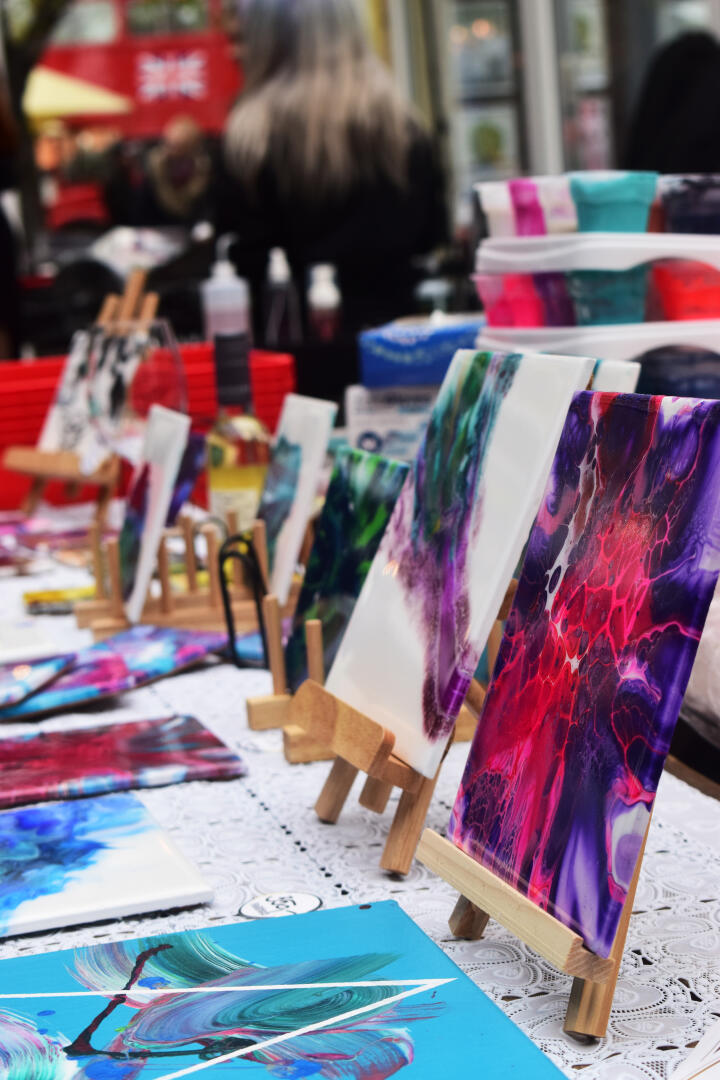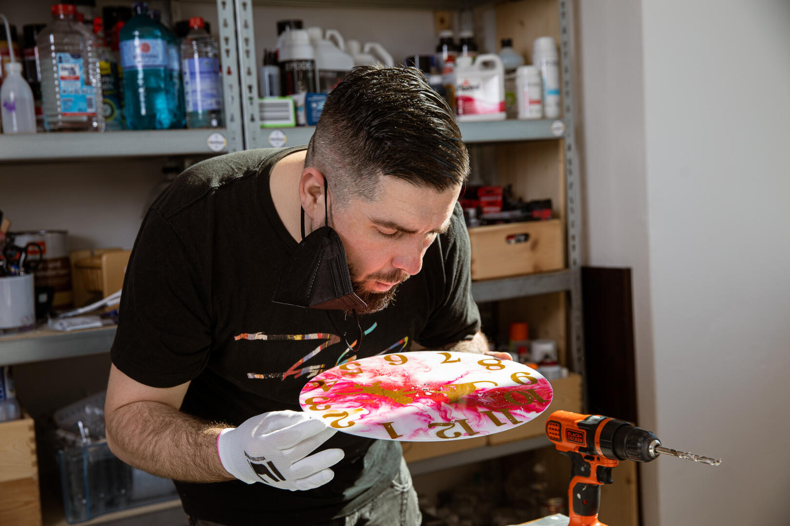 Workshop začíná uvítáním – čeká vás welcome drink, ochranná zástěra a společné seznámení s tím, jak správně míchat a lít akrylové i pigmentové barvy. Pak už se pustíte do vlastního tvoření. Vyberete si, zda chcete malovat keramické podtácky, obraz na plátně nebo vytvořit stylové hodiny ze staré gramofonové desky. A pokud vás láká zkusit všechno, je tu varianta „all in“ – s magnetkou a boxem na kapesníky jako bonusem.