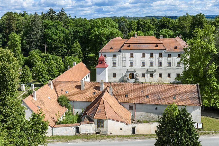 Zámek stojí na místě původní vodní tvrze ze 13. stol., přebudované v 16. stol. na renesanční zámek. Dnešní podobu získal za výrazné přestavby v honosné barokní letní sídlo ve 20. letech 18. stol. za hr. Paarů. V téže době byl kolem zámku zřízen park s bohatou sochařskou výzdobou.