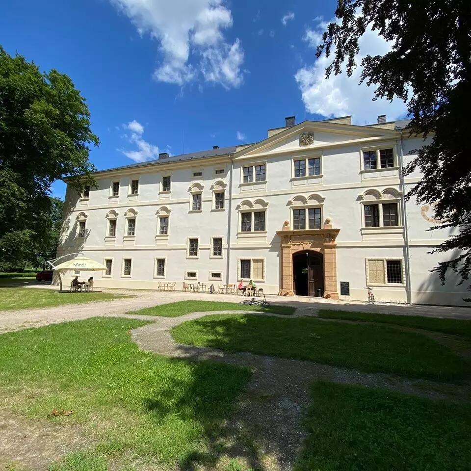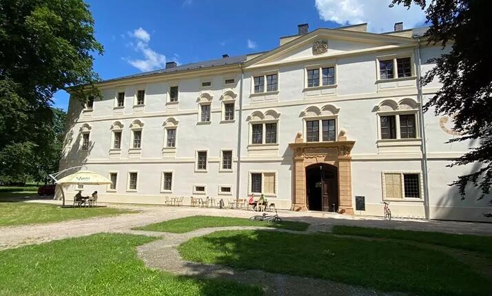 Stavba dvoukřídlého zámku, sousedního kostela a fary trvala deset let. Objekt se od doby vzniku dočkal několika úprav a přestaveb. Z druhé poloviny 17. století pochází velký barokní Kamenný sál, k němuž přiléhá výklenek s kaplí Svaté Panny Marie Sedmibolestné, bohatě zdobené štuky. Pravděpodobně stejně staré jsou i Modré salonky – dámské pokoje pyšnící se rokokovými freskami s výjevy ze života šlechty. Pokoje vymalovali Holandští a Italští mistři dle vzoru Delftské fajáns, tedy porcelánu, který se vyrábí do dnešních dnů v městečku Delfty v Nizozemsku. Za pozornost stojí kopie obrazu Gerharda Ter Borcha, jejíž originál najdete v obrazárně Národního muzea v Amsterdamu a další neméně zajímavé obrazové výjevy s tajemnými sděleními.