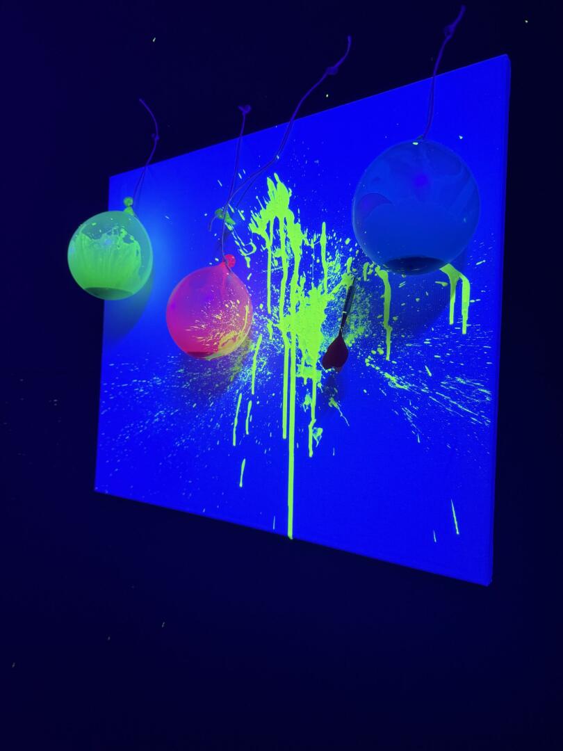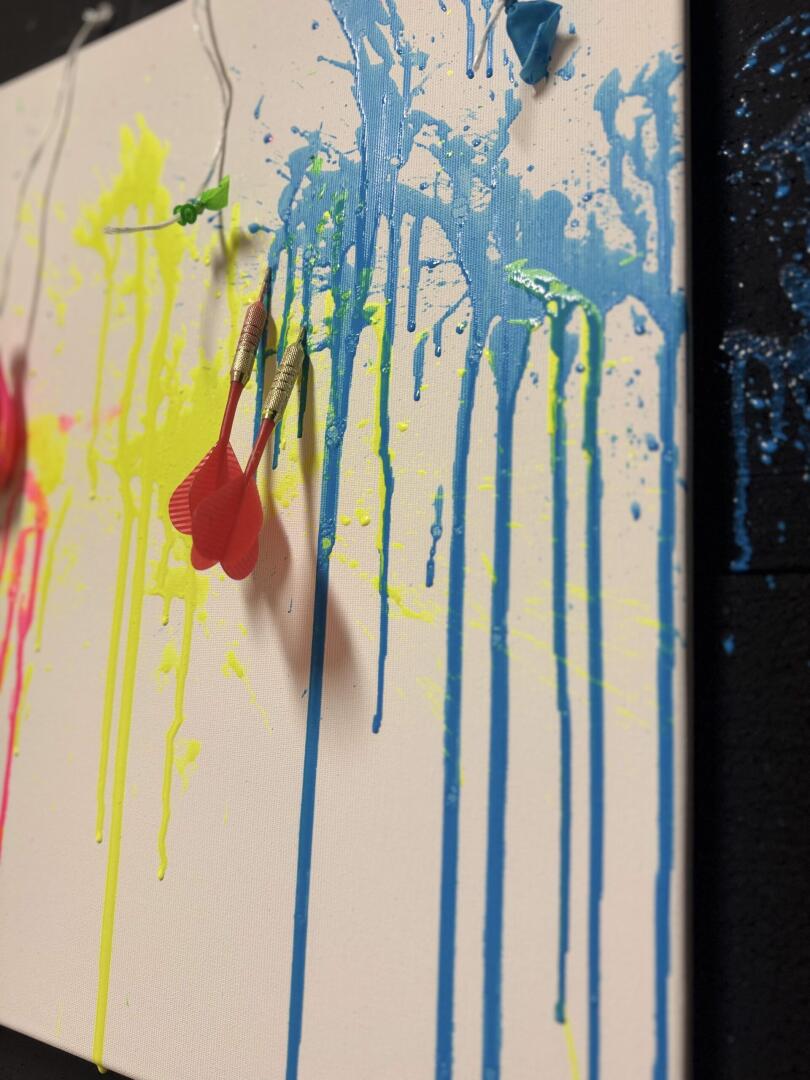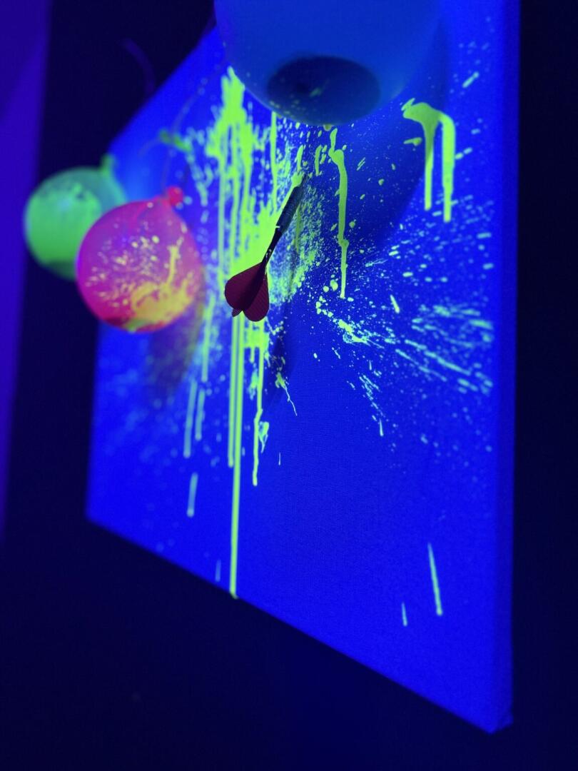 Balónky - připrav se na explozi umění! Balónky naplněné barvami připevníme na plátno, a ty do nich házíš šipky! Jakmile balónky prasknou, barvy se rozstříknou a vytvoří divoké, jedinečné vzory plné energie. Každý hod je překvapením, každý výbuch tvoří originální mistrovské dílo! Tahle technika je o zábavě, napětí a nečekaných, ale vždy úchvatných výsledcích.